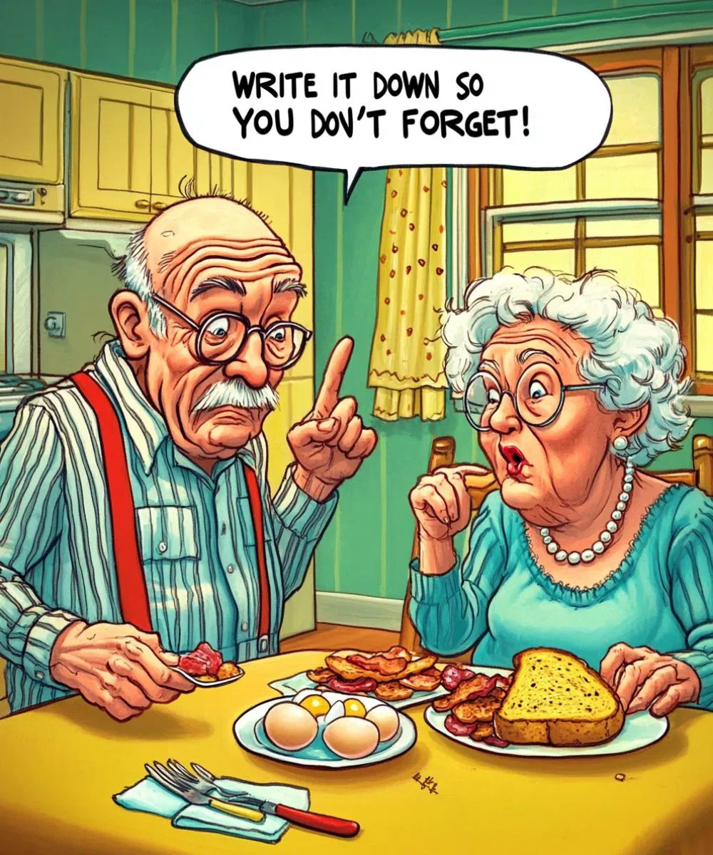 The wife stared at the plate and yelled, “I told you to write it down! Where’s my toast?!”